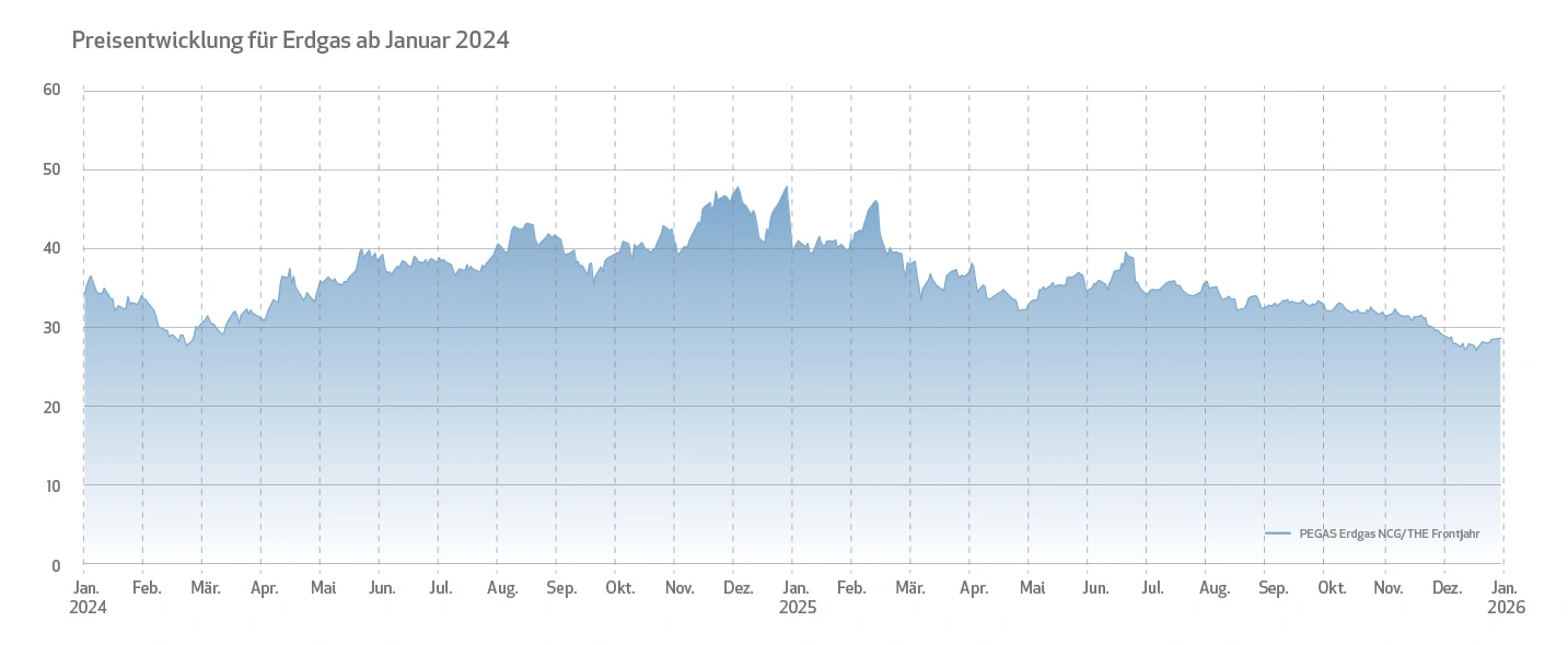 Der Gaspreis fiel im vierten Quartal 2025 von 33,19 € auf knapp unter 28 €. Damit lag der Preis rund 8 € unter den Preisen des vergangenen Sommers für das gleiche Produkt.