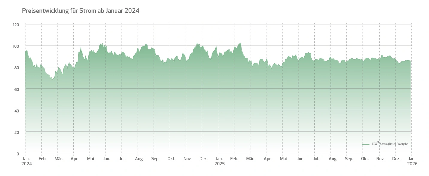 Das Frontjahr für Strom (Base) an der EEX stieg Anfang Oktober stark und erreichte 88,30 €, der höchste Preis seit Juli 2025. Bis zum Quartalsende bewegte sich der Strompreis um ein Mittel von rund 85 Euro.
