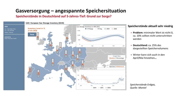 Ein zentraler Unsicherheitsfaktor ist der Konflikt um den Iran. Die Straße von Hormus – durch die rund ein Fünftel der globalen Energieflüsse läuft – ist ein kritischer Engpass. Auch wenn Europa direkt weniger betroffen ist, beeinflusst die Situation die globalen Preise erheblich, da die Transportkosten (v.a. Versicherungen) für LNG-Transporte deutlich steigen.