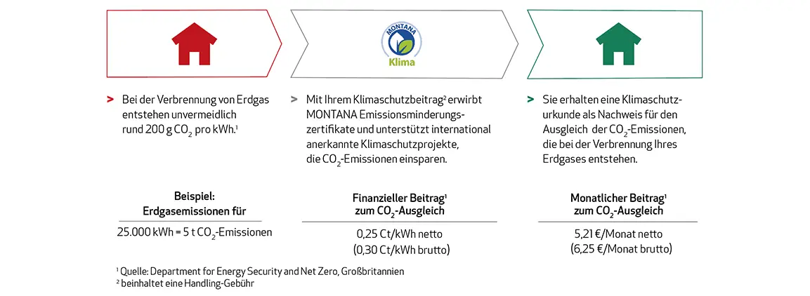 Für einen geringen Aufschlag1 auf Ihren gewählten Erdgastarif leisten Sie einen finanziellen Beitrag zum Klimaschutz. Die CO2-Emissionen, die bei der Verbrennung des Erdgases entstehen, werden ausgeglichen. Hierzu unterstützt MONTANA ein international anerkanntes Klimaschutzprojekt, das C02-Emissionen einspart.