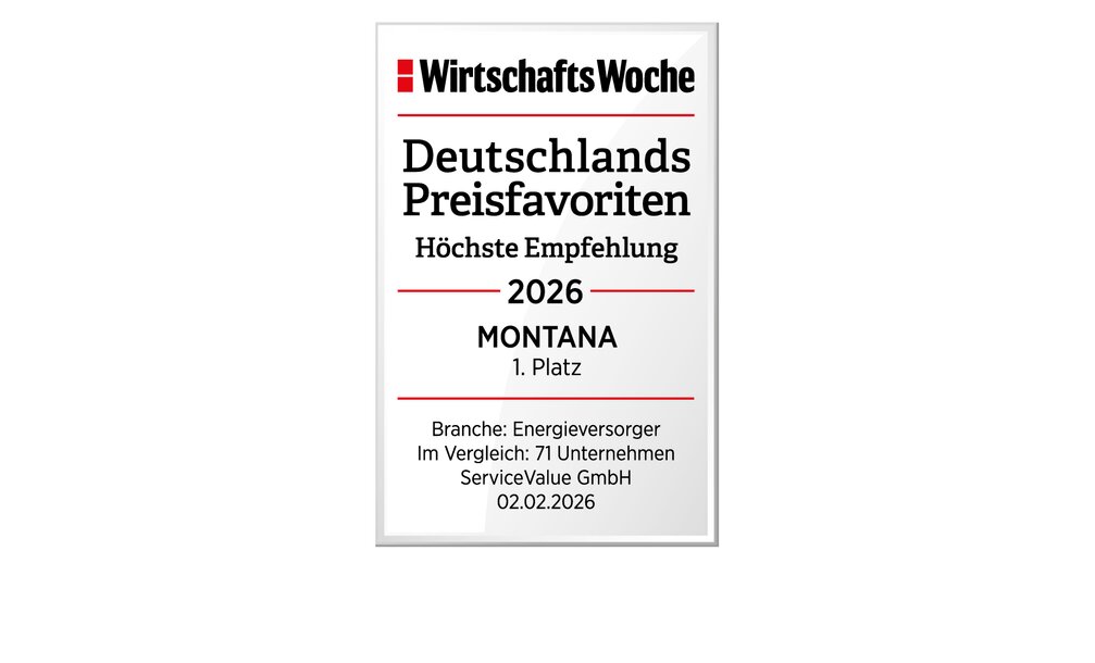 Die Analyse- und Beratungsgesellschaft ServiceValue befragte in Kooperation mit der WirtschaftsWoche Verbraucher danach, welche Unternehmen sie als besonders günstig empfinden. Die Antworten der über 250.000 Befragten wurden ausgewertet und bestätigten: MONTANA ist zum vierten Mal in Folge Preisfavorit unter den Energieversorgern.