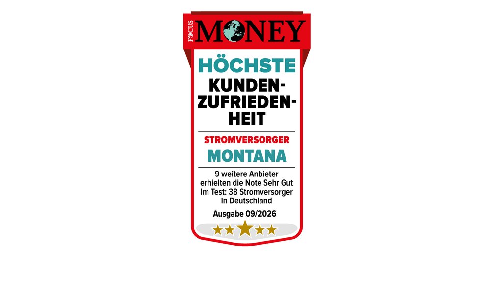 Schon zum fünften Mal in Folge wurde MONTANA von Focus MONEY mit dem Qualitätssiegel „Höchste Kundenzufriedenheit“ ausgezeichnet. Damit gehört MONTANA auch 2025 zu den Stromversorgern in Deutschland mit den besten Bewertungen. In die repräsentative Umfrage flossen rund 267.000 Verbraucherstimmen zu 1.585 Unternehmen und Marken aus 74 Branchen ein. MONTANA gehört zu den Stromanbietern, die sich erneut im oberen Bereich der Kategorie "Höchste Kundenzufriedenheit" platzieren konnten.