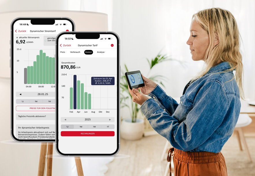 Haben Sie unseren dynamischen Stromtarif ÖkoStrom Plus (Dynamic) abgeschlossen, können Sie in der App jederzeit auf die Börsenpreise zugreifen und Ihren Verbrauch im Tagesverlauf einsehen.